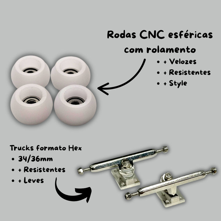 Disponível nos tamanhos 34mm e 36mm, este modelo é indicado para quem deseja um fingerboard de qualidade superior, porém inferior à linha Pro Elite.