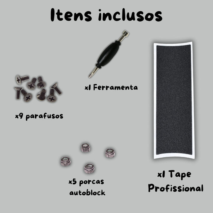 Com trucks de metal de alta durabilidade e rodas com rolamento, o Skate de Dedo Completo Pro garante um deslize suave e uma performance incrível em qualquer superfície, proporcionando uma experiência de alto nível.